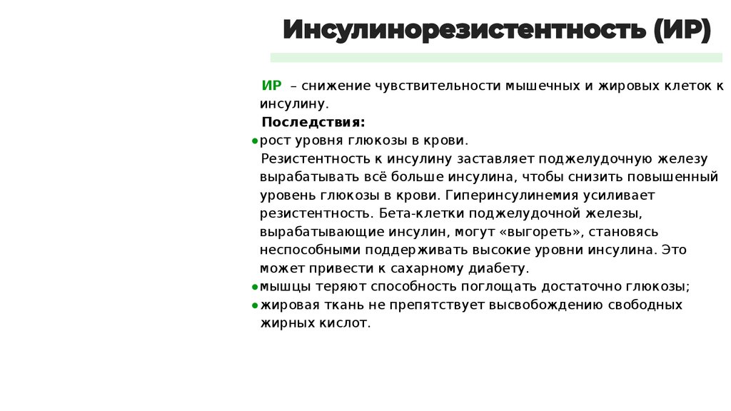 ИР – снижение чувствительности мышечных и жировых клеток кинсулину.