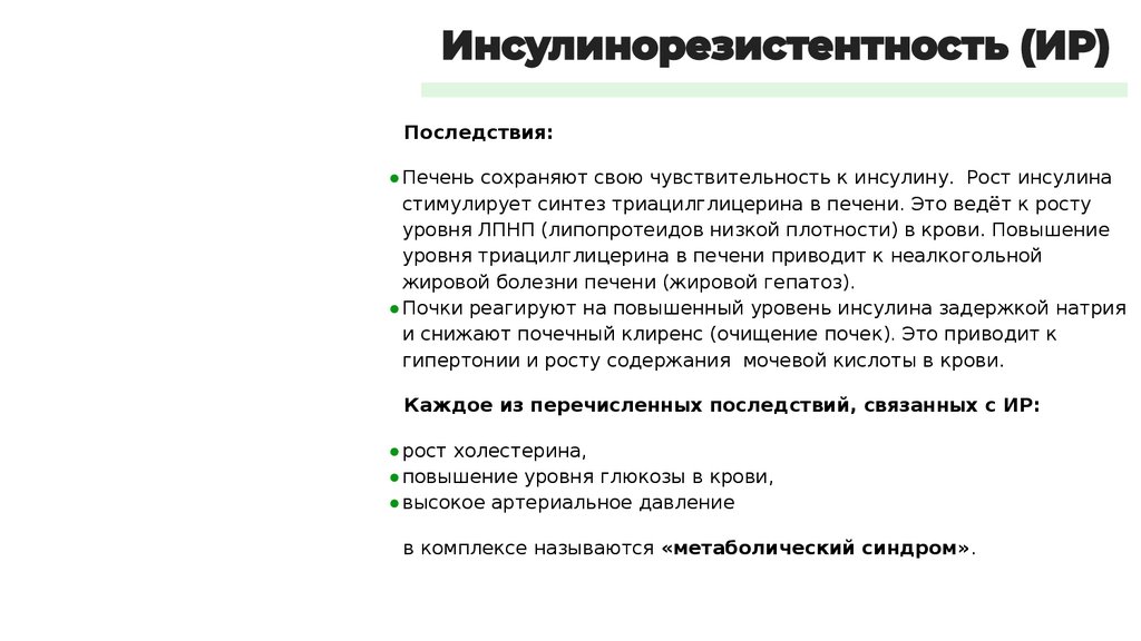 Последствия:●Печень сохраняют свою чувствительность к инсулину. Рост инсулина