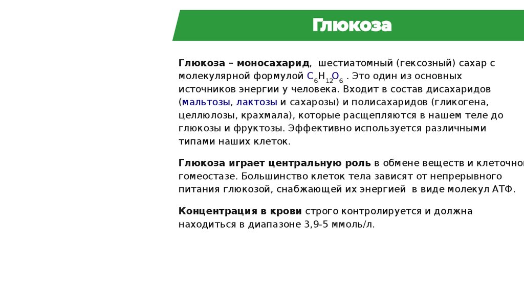 Глюкоза – моносахарид, шестиатомный (гексозный) сахар смолекулярной формулой C 6Н 12O 6 . Это один из основных