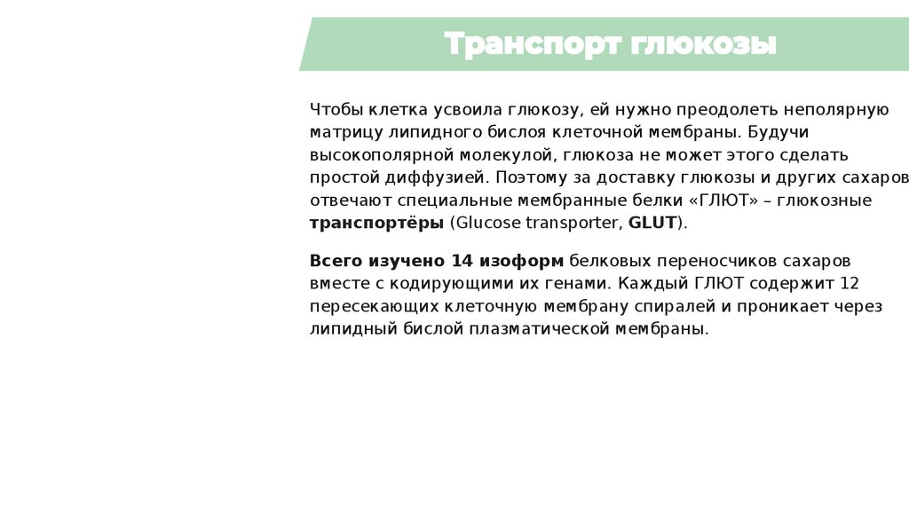Чтобы клетка усвоила глюкозу, ей нужно преодолеть неполярнуюматрицу липидного бислоя клеточной мембраны. Будучи