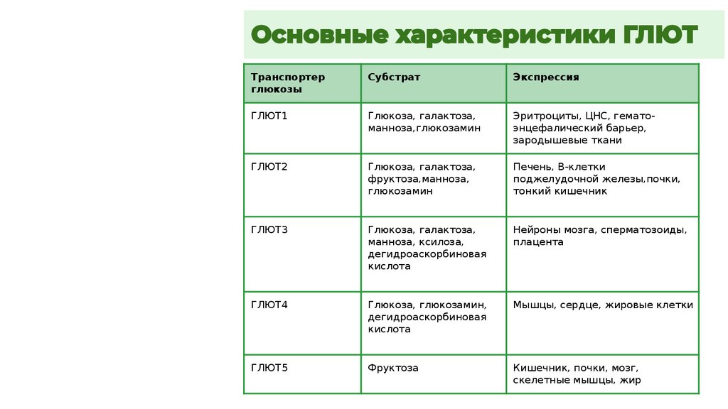 Всего изучено 14 изоформ белковых переносчиков сахаров
