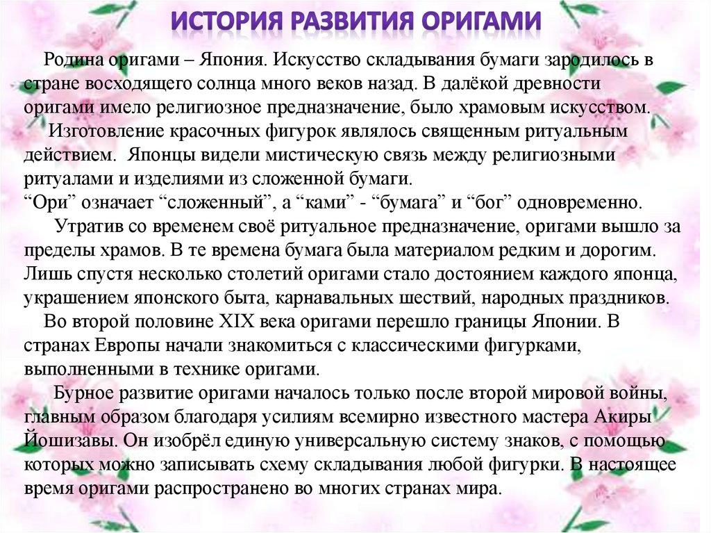 Родина оригами – Япония. Искусство складывания бумаги зародилось встране восходящего солнца много веков назад. В далёкой древности