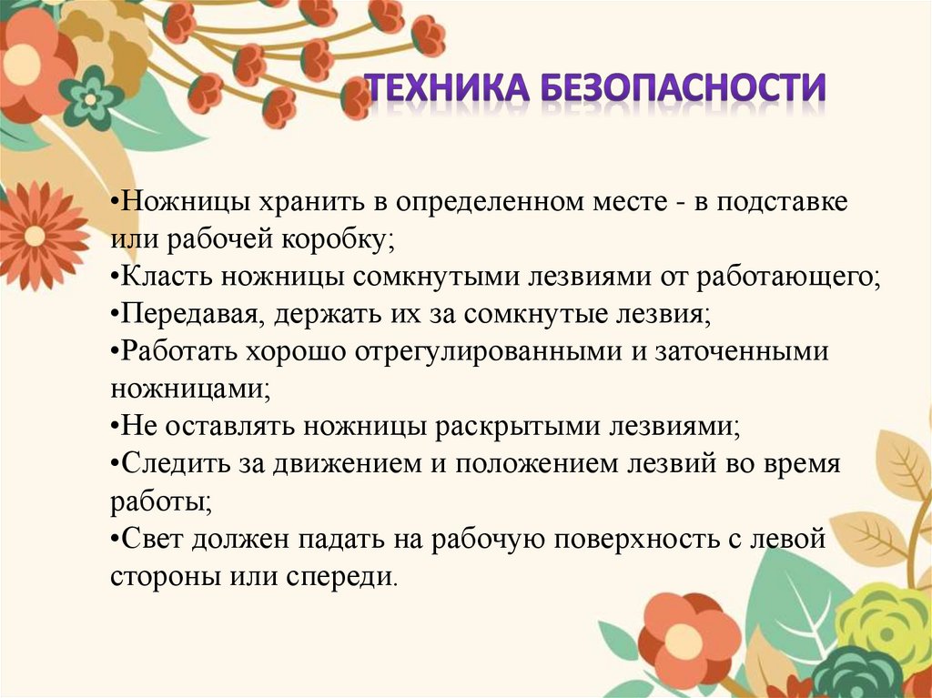 •Ножницы хранить в определенном месте - в подставкеили рабочей коробку;