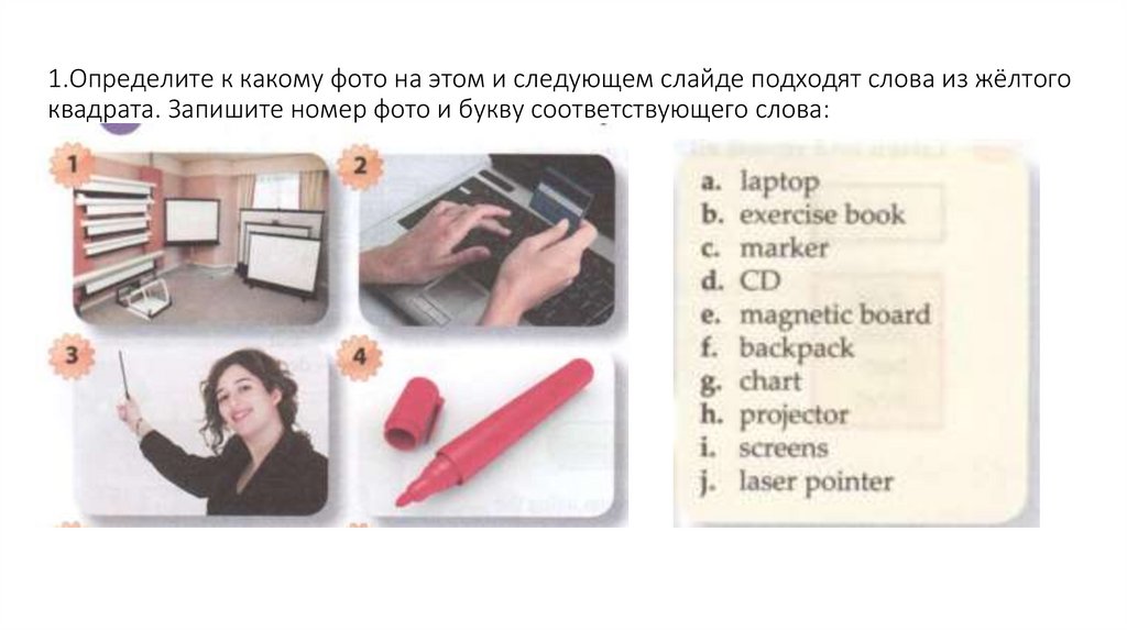 1.Определите к какому фото на этом и следующем слайде подходят слова из жёлтогоквадрата. Запишите номер фото и букву соответствующего слова: