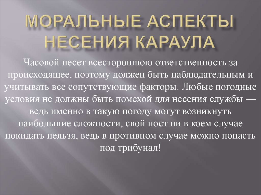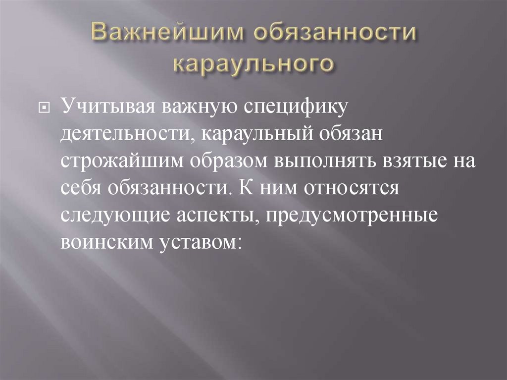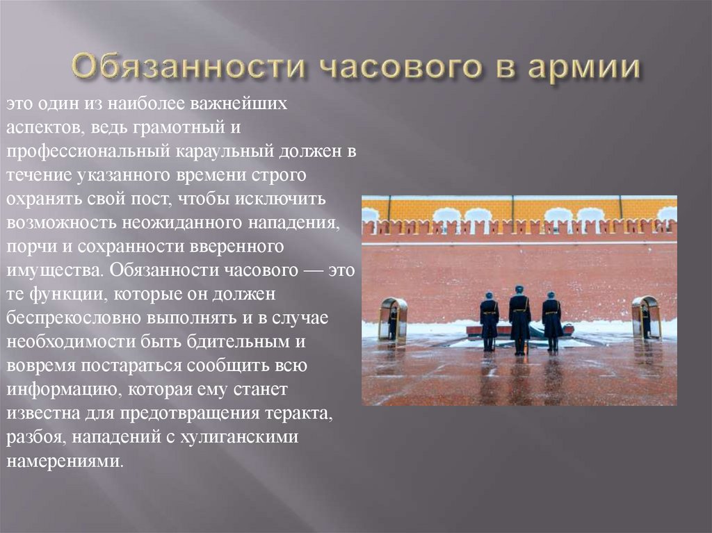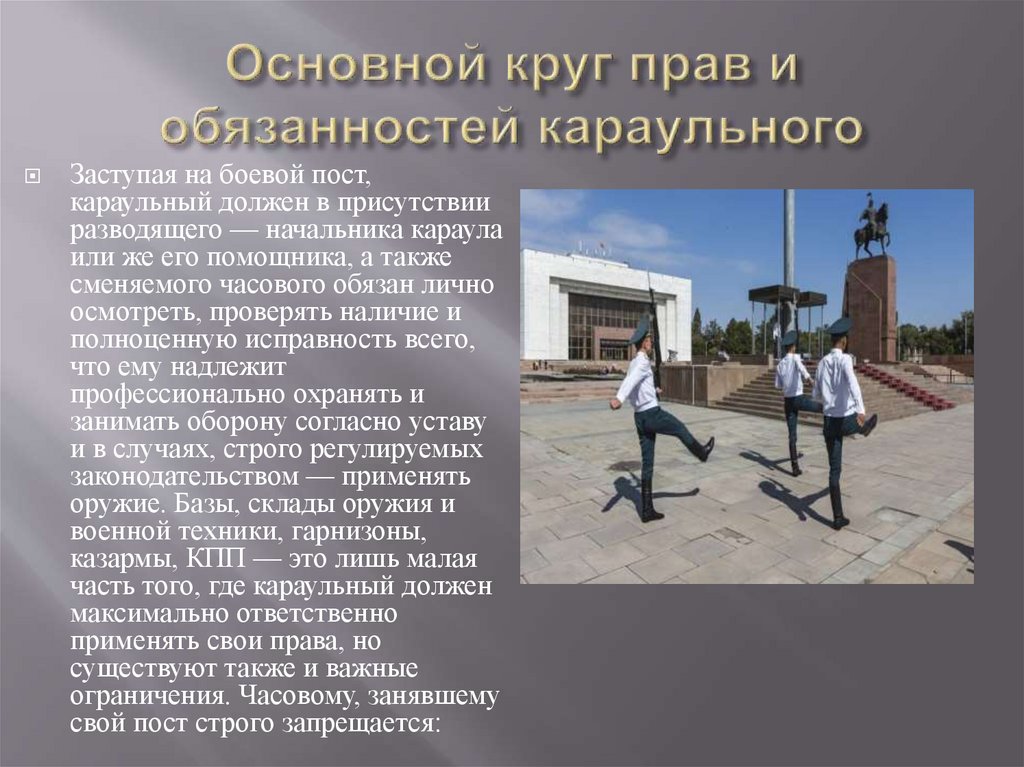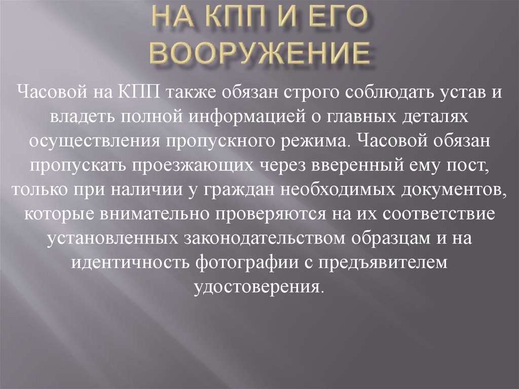 Часовой на КПП также обязан строго соблюдать устав ивладеть полной информацией о главных деталях