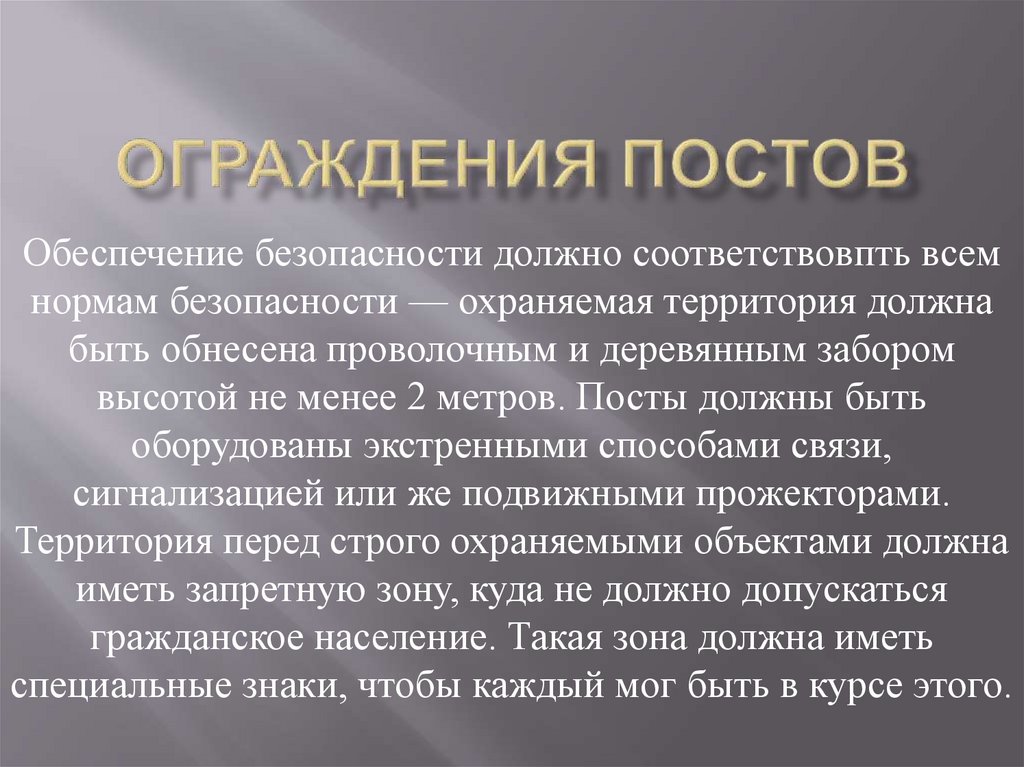Обеспечение безопасности должно соответствовпть всемнормам безопасности — охраняемая территория должна