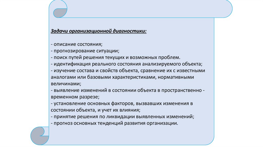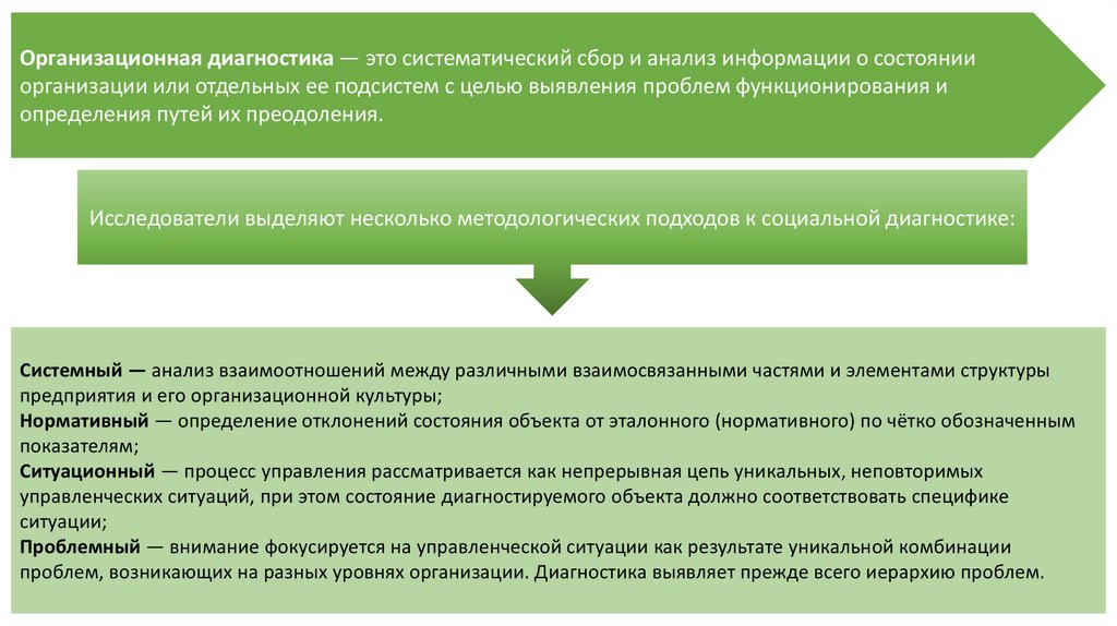 Организационная диагностика — это систематический сбор и анализ информации о состоянииорганизации или отдельных ее подсистем с целью выявления проблем функционирования и