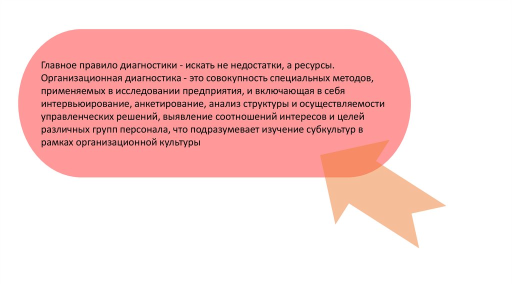Главное правило диагностики - искать не недостатки, а ресурсы.Организационная диагностика - это совокупность специальных методов,