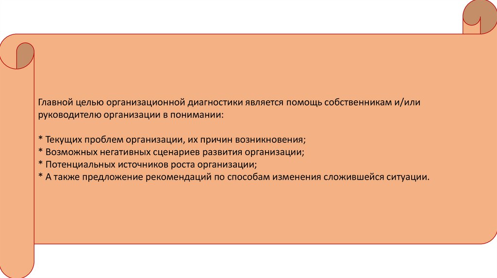 Главной целью организационной диагностики является помощь собственникам и/илируководителю организации в понимании: