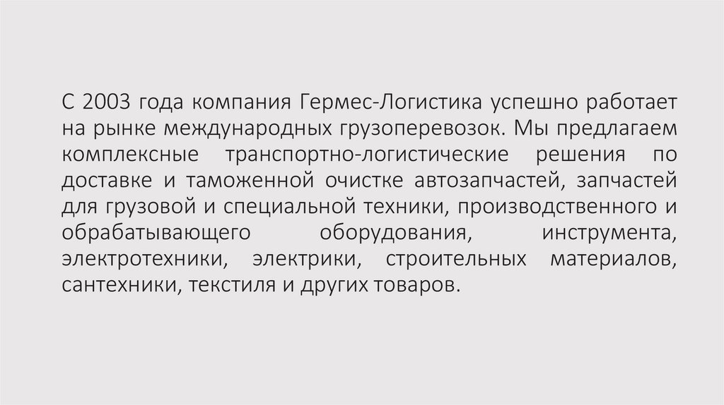 С 2003 года компания Гермес-Логистика успешно работаетна рынке международных грузоперевозок. Мы предлагаем