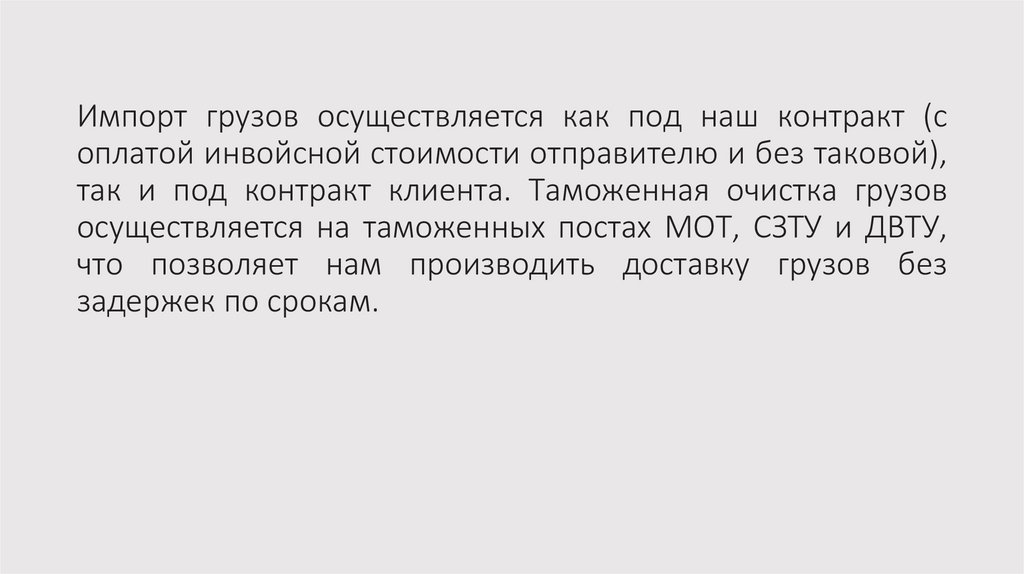 Импорт грузов осуществляется как под наш контракт (соплатой инвойсной стоимости отправителю и без таковой),