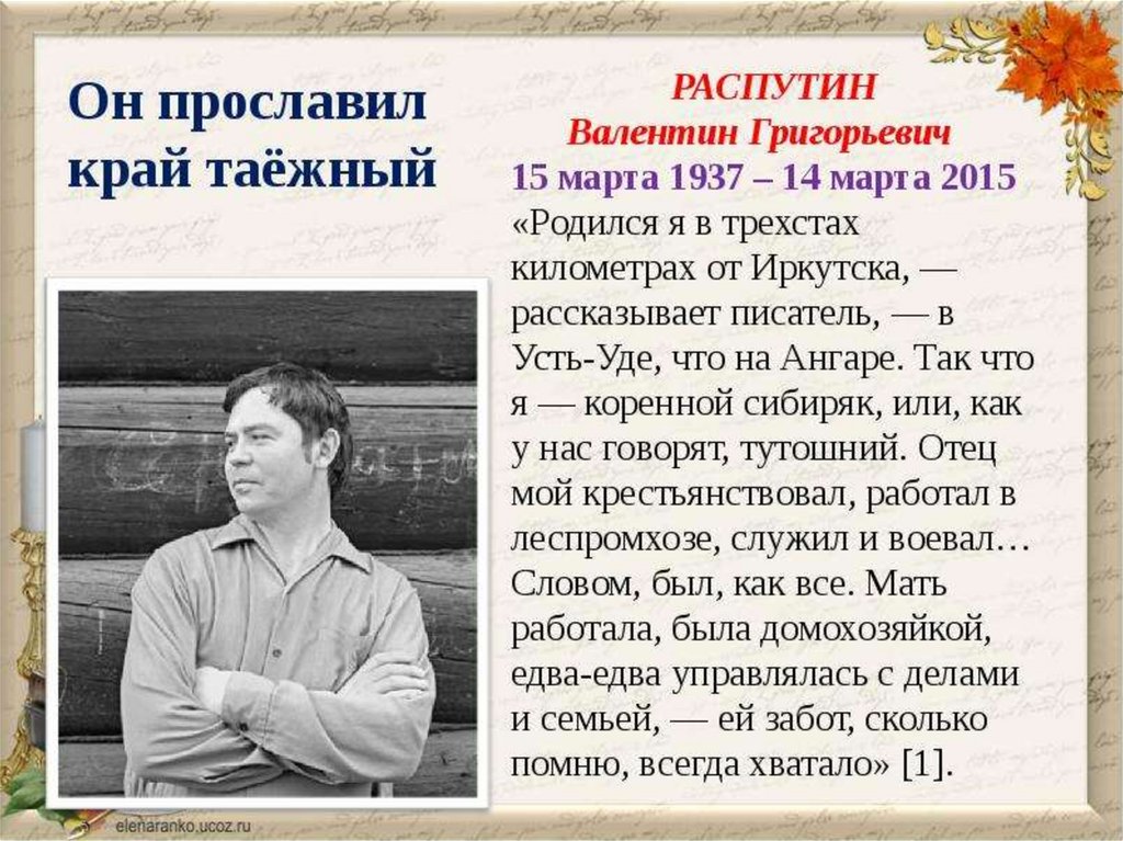 Жизнь и творчество Валентина Григорьевича Распутина