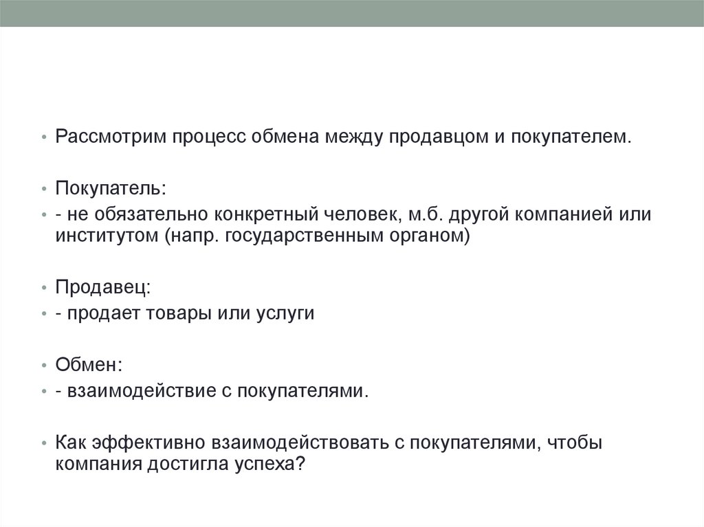 • Рассмотрим процесс обмена между продавцом и покупателем.• Покупатель: