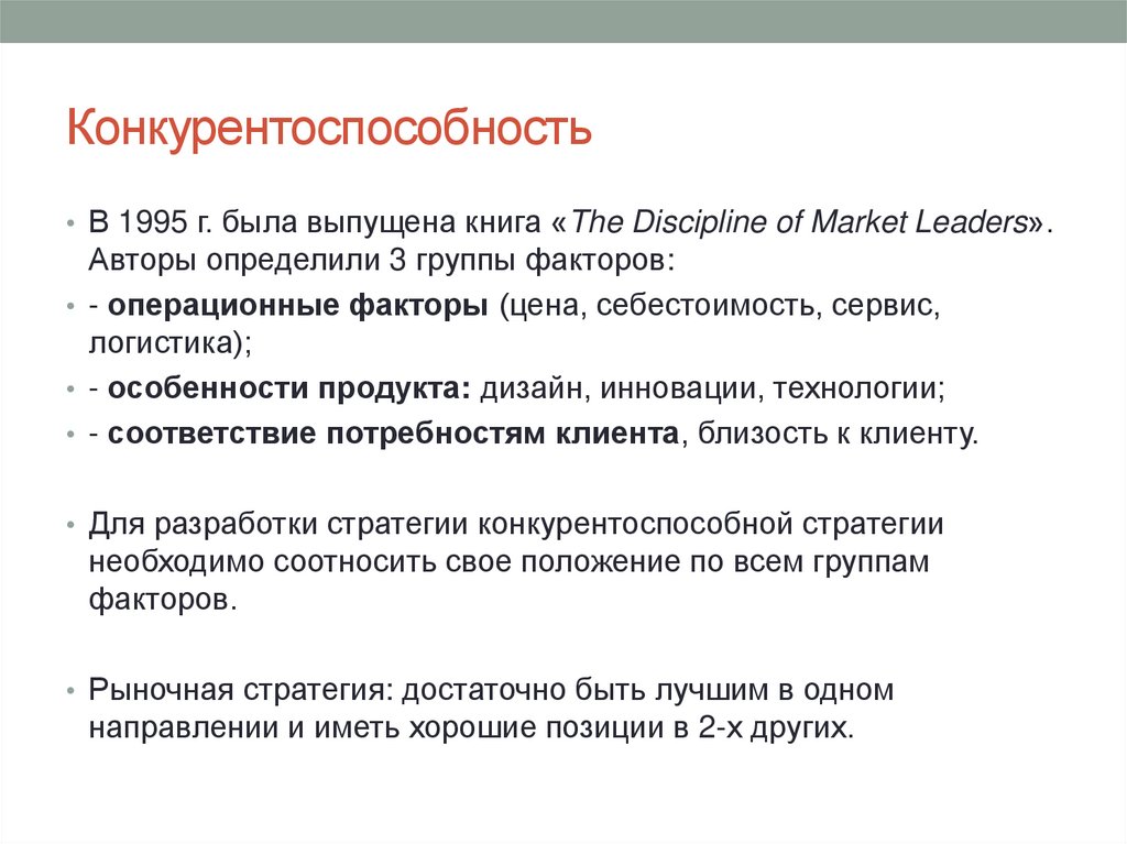 Конкурентоспособность• В 1995 г. была выпущена книга «The Discipline of Market Leaders».