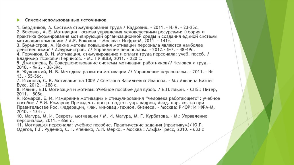 Список использованных источников1. Бердников, А. Система стимулирования труда / Кадровик. – 2011. – № 9. – 23-25с.