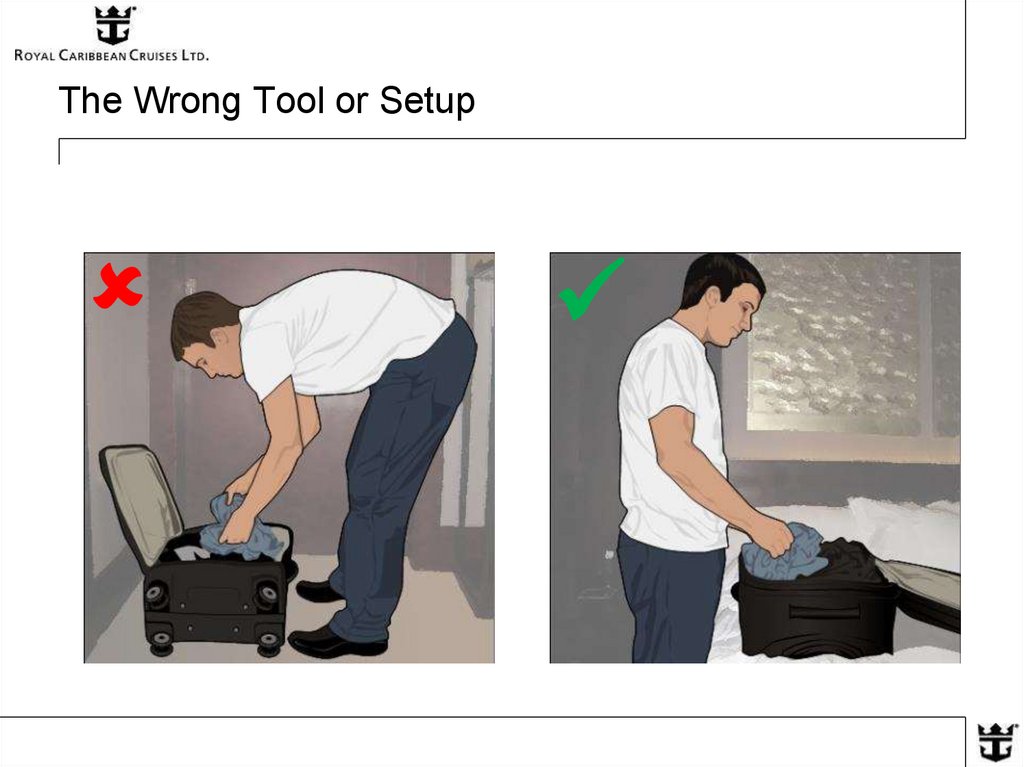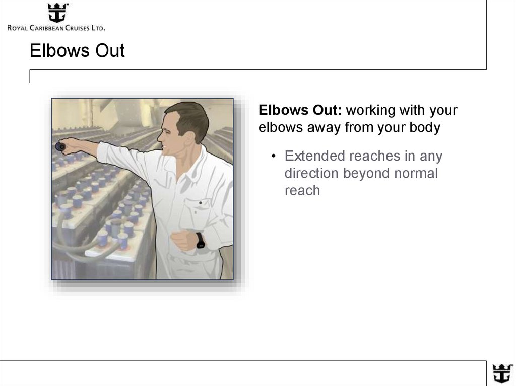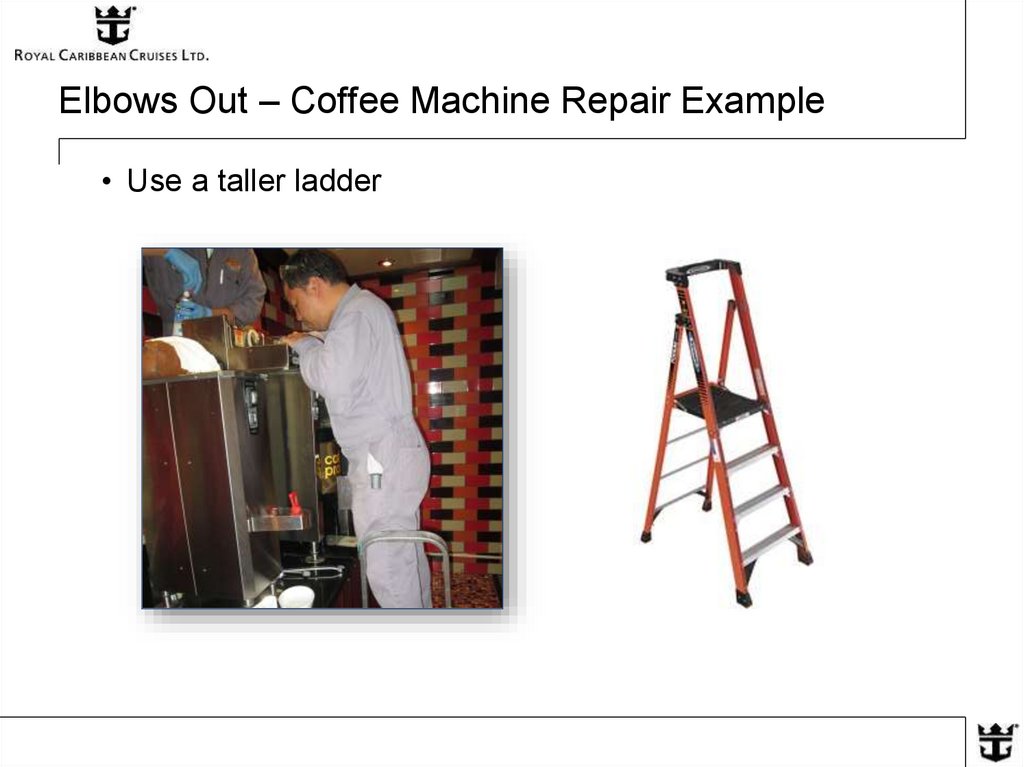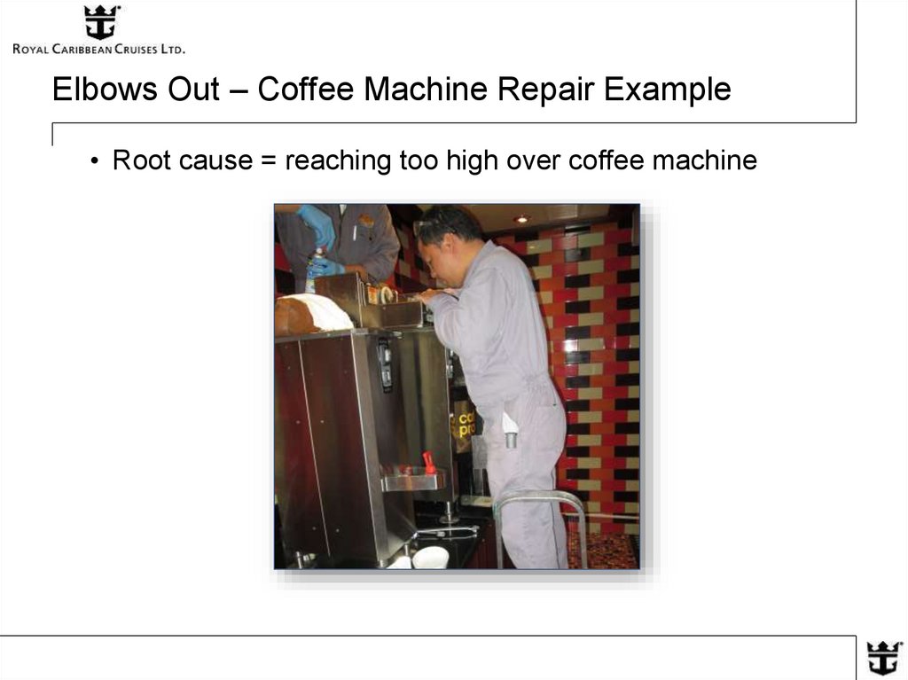Elbows Out – Coffee Machine Repair Example• Root cause = reaching too high over coffee machine