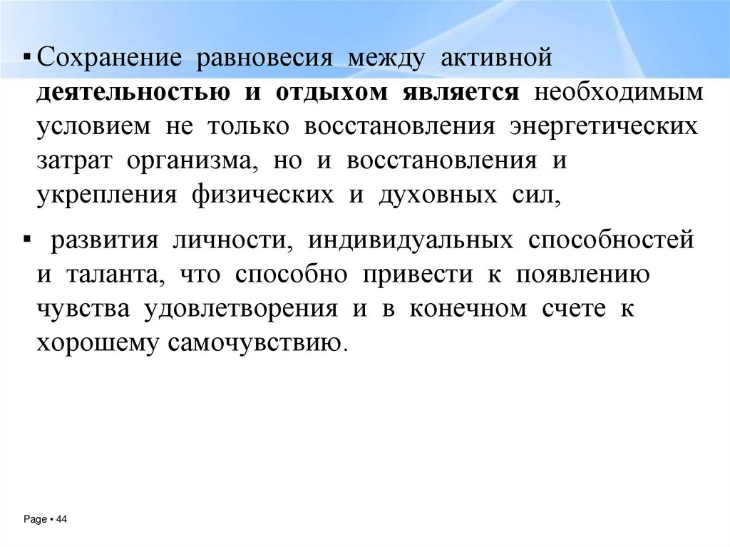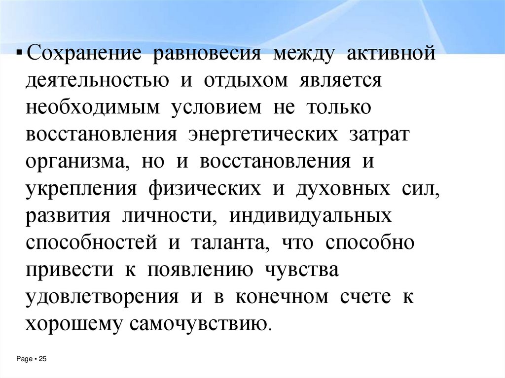 ▪ Сохранение равновесия между активнойдеятельностью и отдыхом является необходимым