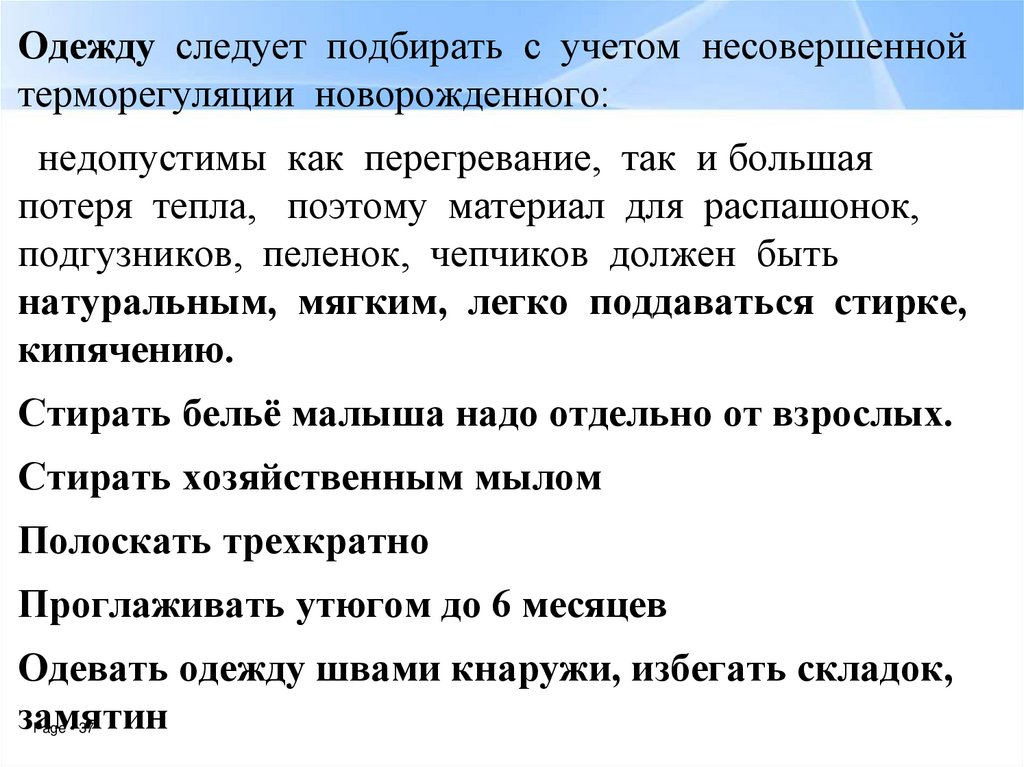 Одежду следует подбирать с учетом несовершеннойтерморегуляции новорожденного: