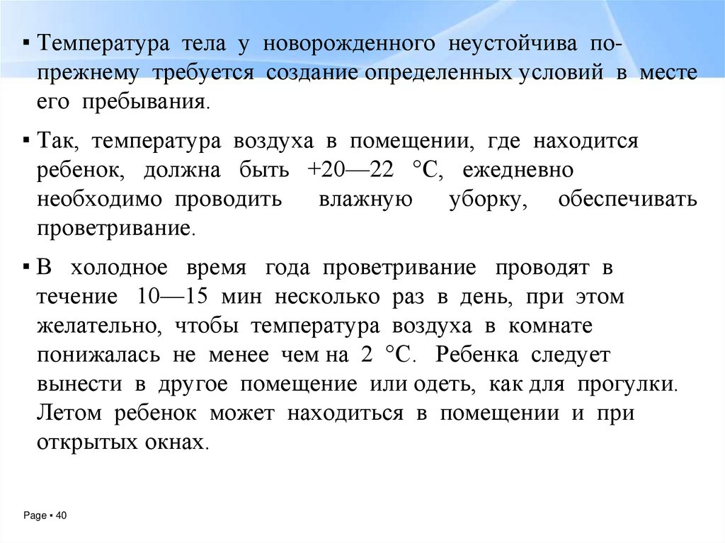▪ Температура тела у новорожденного неустойчива попрежнему требуется создание определенных условий в местеего пребывания.