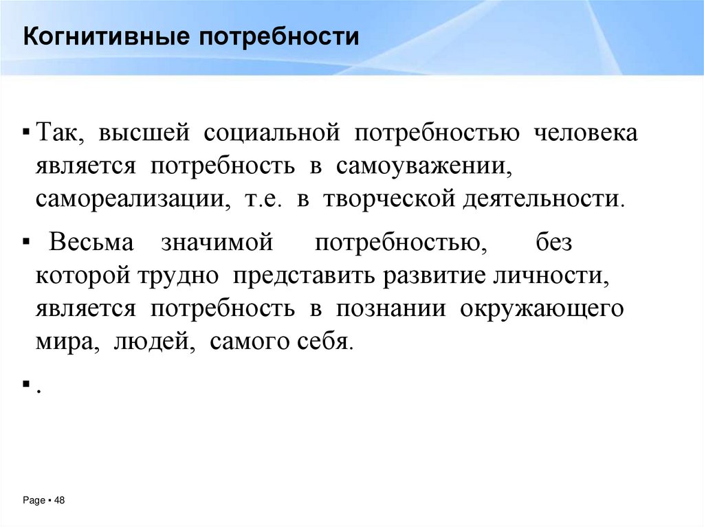 Когнитивные потребности▪ Так, высшей социальной потребностью человека