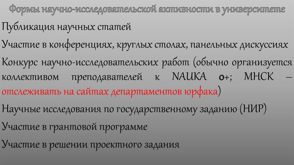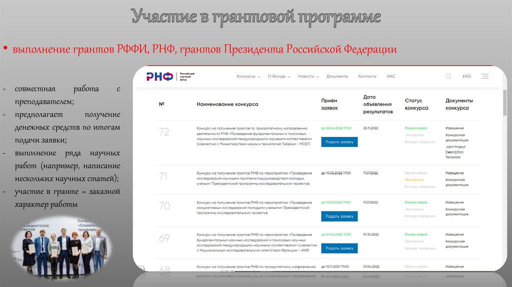 • выполнение грантов РФФИ, РНФ, грантов Президента Российской Федерации- совместная