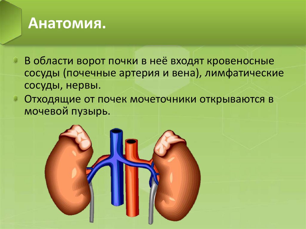 Анатомия.В области ворот почки в неё входят кровеносные