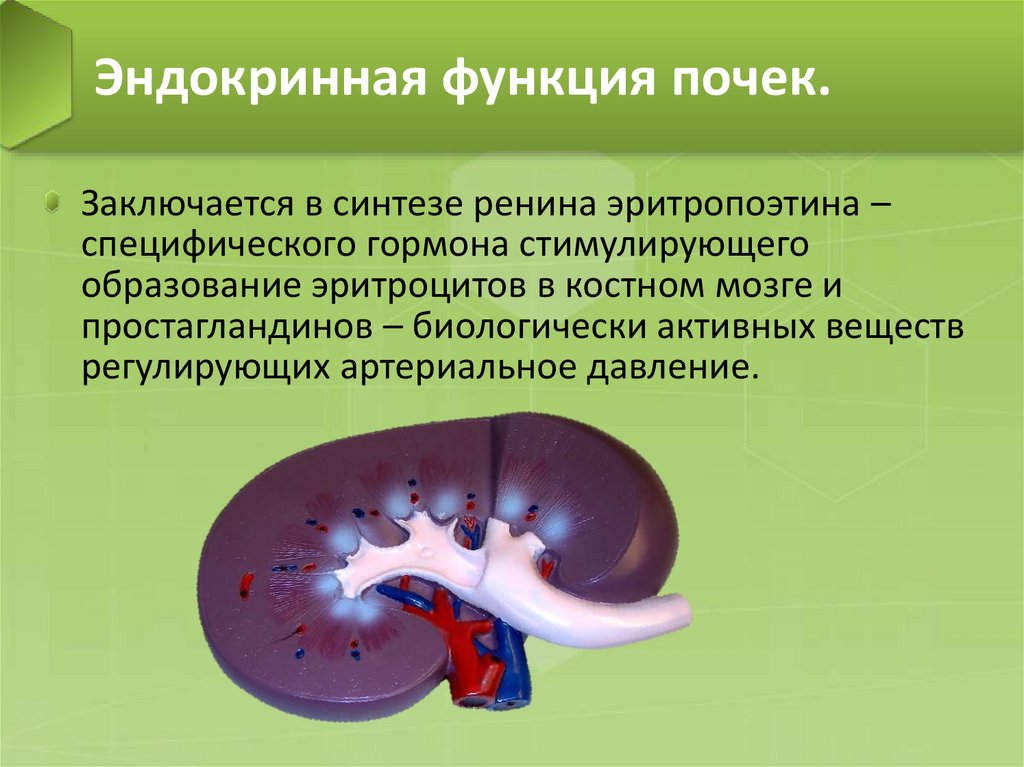 Эндокринная функция почек.Заключается в синтезе ренина эритропоэтина –