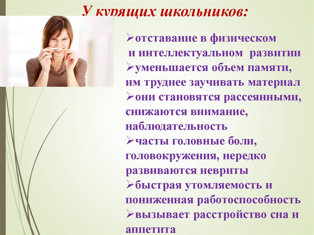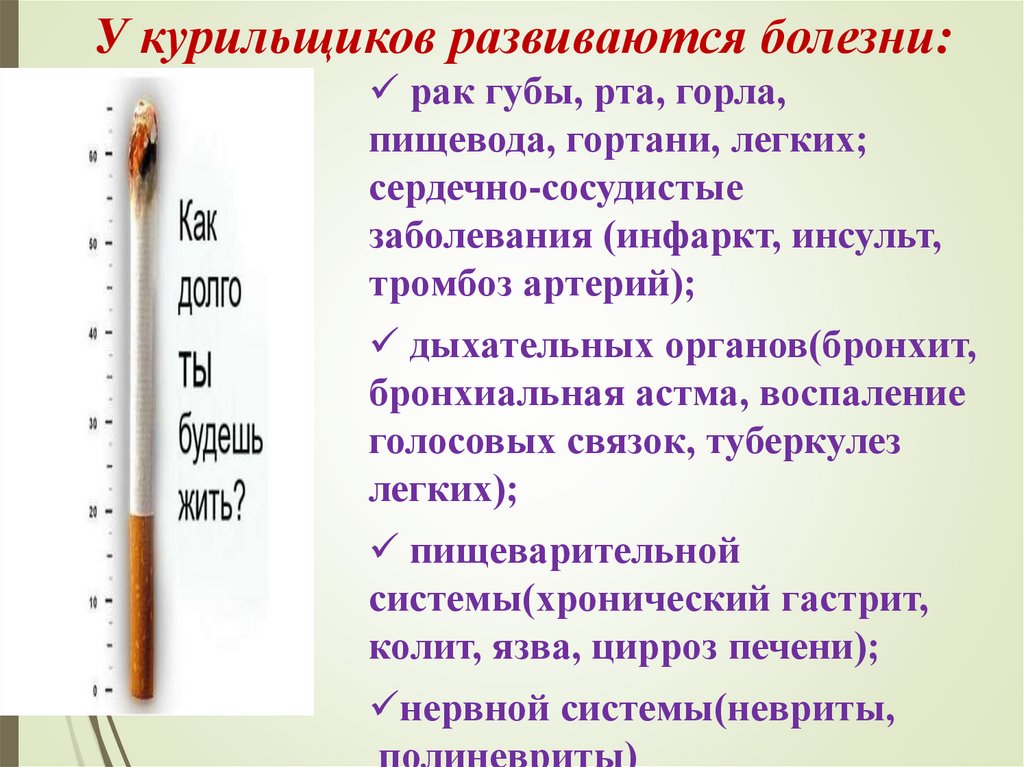 У курильщиков развиваются болезни:рак губы, рта, горла,
