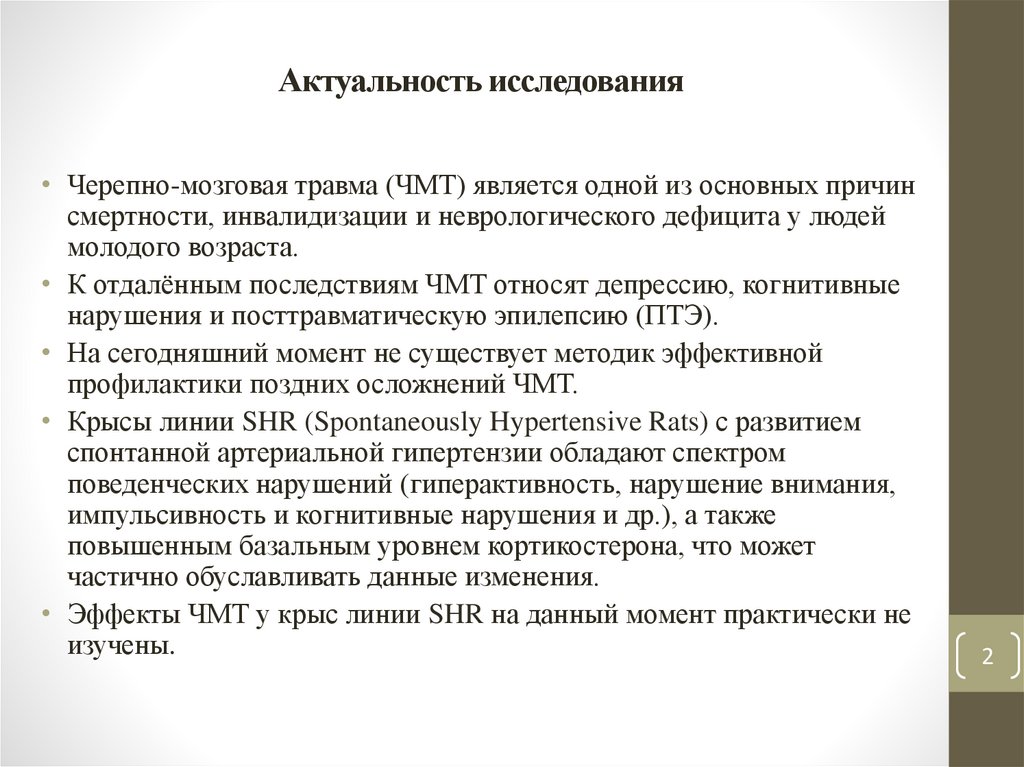 Актуальность исследования• Черепно-мозговая травма (ЧМТ) является одной из основных причин