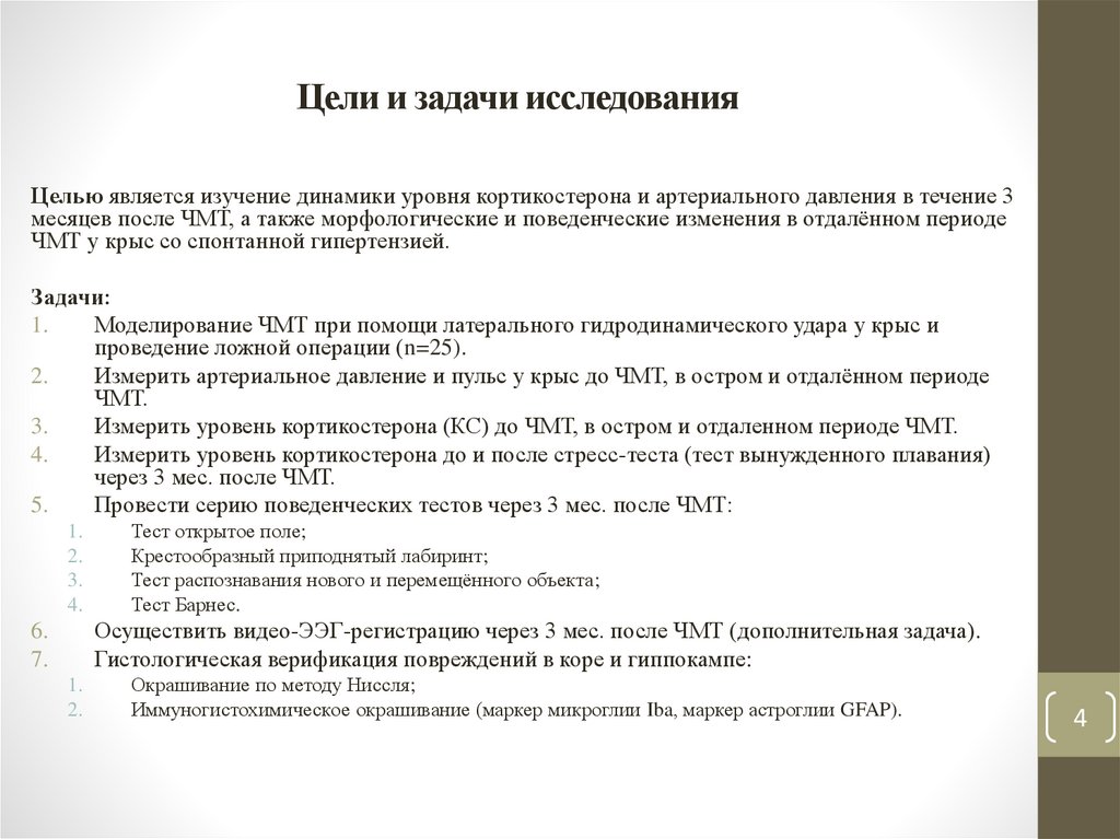 Цели и задачи исследованияЦелью является изучение динамики уровня кортикостерона и артериального давления в течение 3