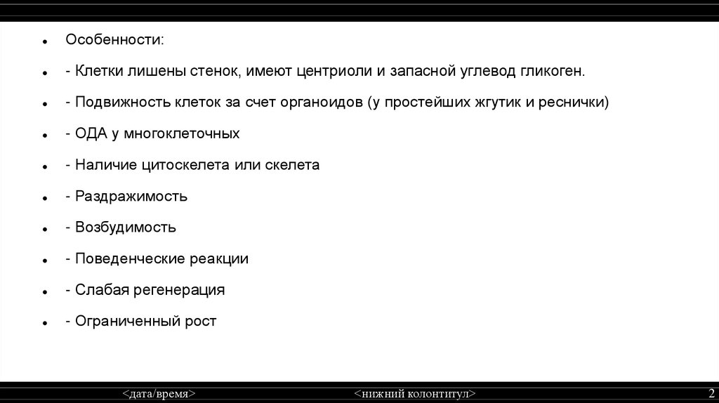 Особенности:- Клетки лишены стенок, имеют центриоли и запасной углевод гликоген.
