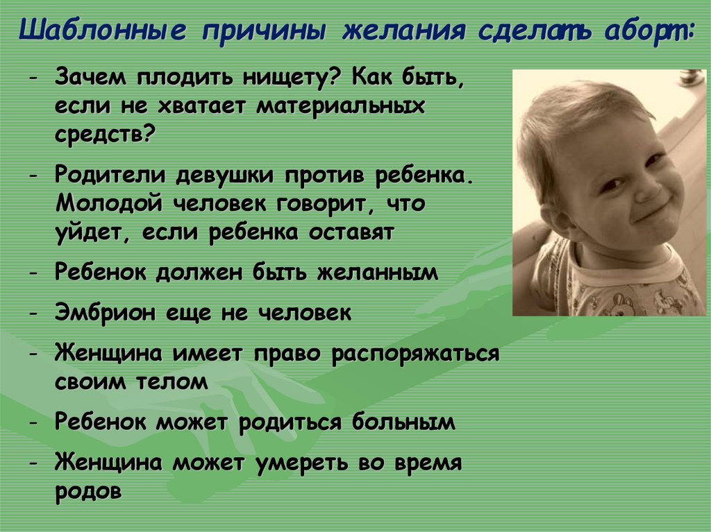 Шаблонные причины желания сделат ь аборт :- Зачем плодить нищету? Как быть,