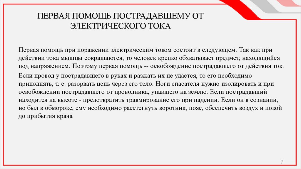 7. ПЕРВАЯ ПОМОЩЬ ПОСТРАДАВШЕМУ ОТ ЭЛЕКТРИЧЕСКОГО ТОКА