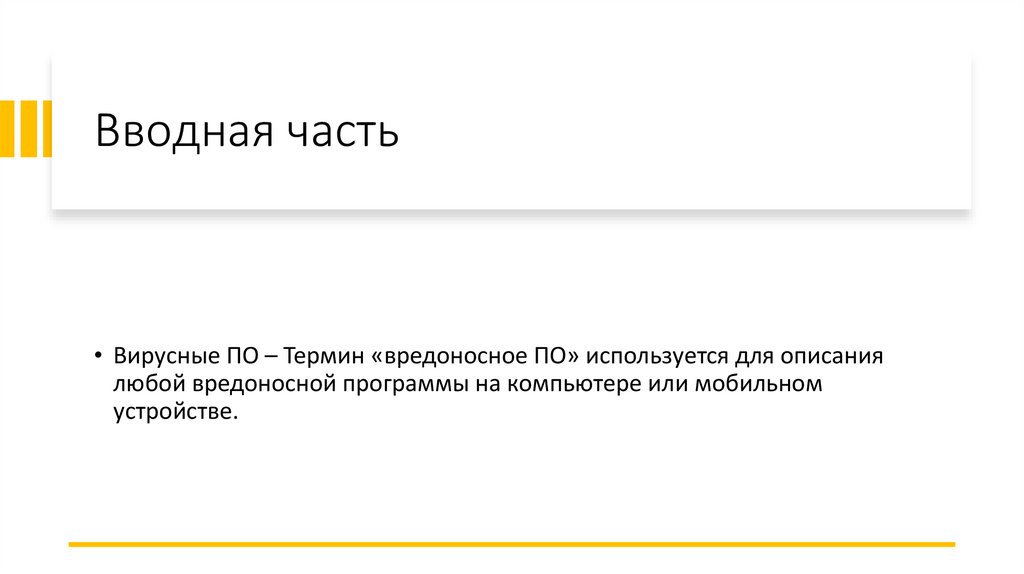 Вводная часть• Вирусные ПО – Термин «вредоносное ПО» используется для описания