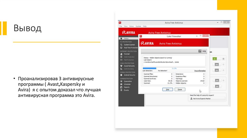 Вывод• Проанализировав 3 антивирусные