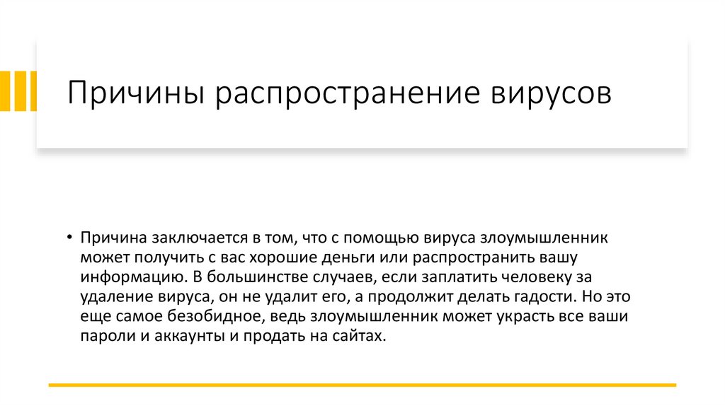 Причины распространение вирусов• Причина заключается в том, что с помощью вируса злоумышленник