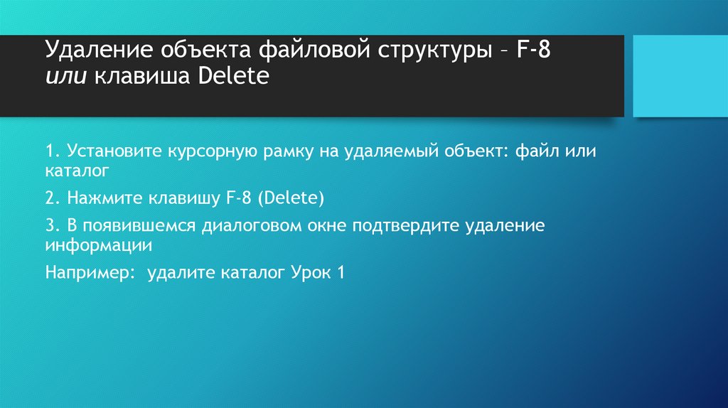Удаление объекта файловой структуры – F-8или клавиша Delete