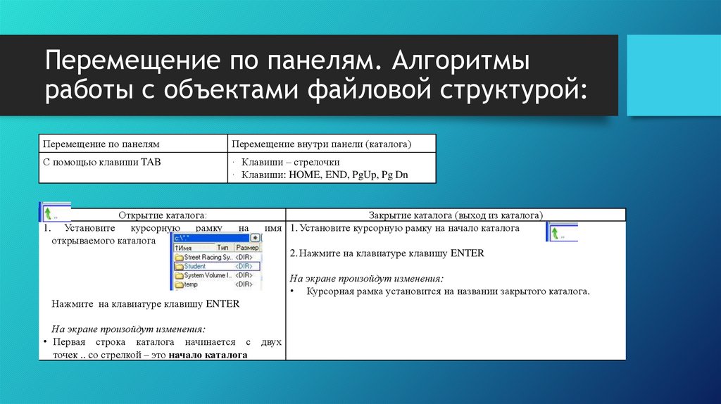 Перемещение по панелям. Алгоритмыработы с объектами файловой структурой: