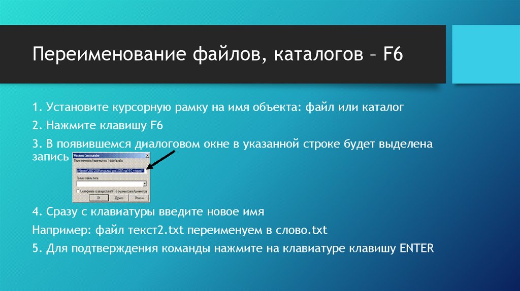 Переименование файлов, каталогов – F61. Установите курсорную рамку на имя объекта: файл или каталог