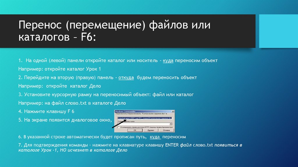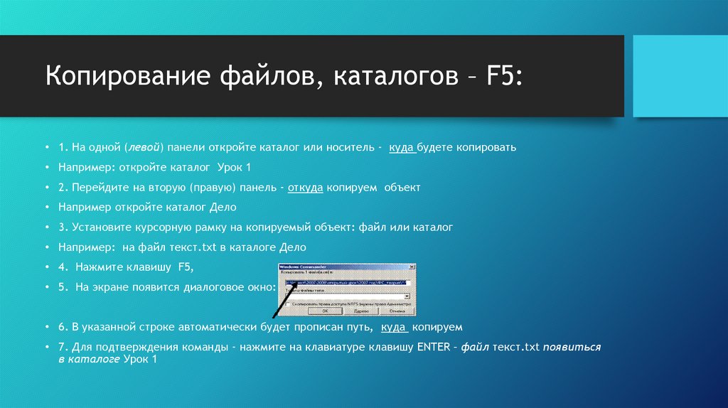 Копирование файлов, каталогов – F5:• 1. На одной (левой) панели откройте каталог или носитель - куда будете копировать