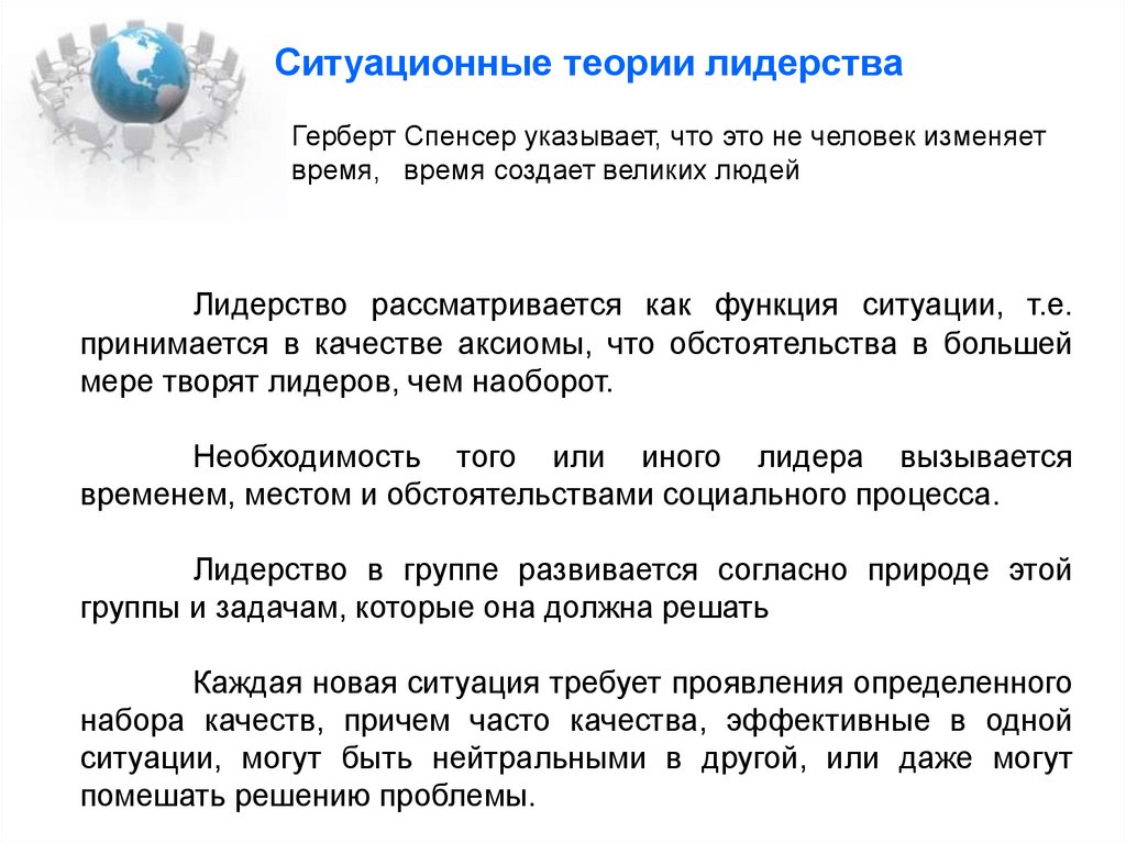 Ситуационные теории лидерстваГерберт Спенсер указывает, что это не человек изменяет