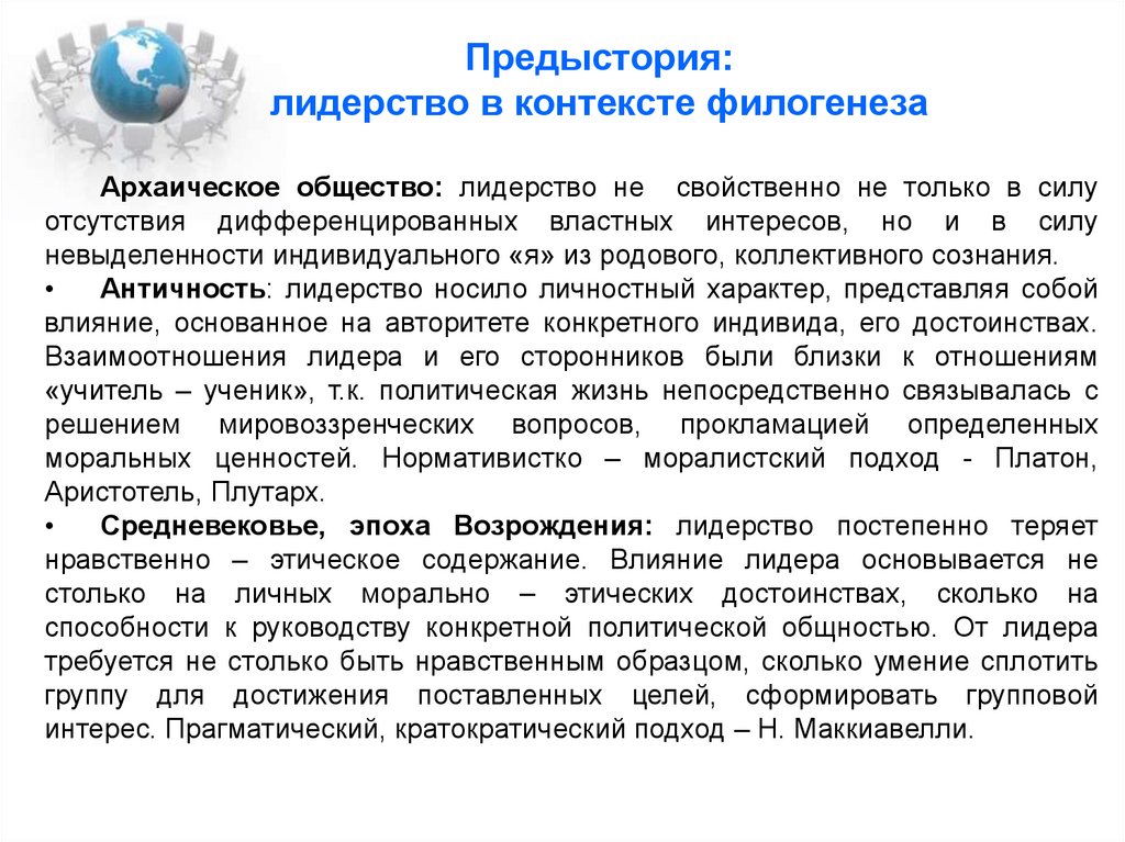 Античность: лидерство носило личностный характер, представляя собой