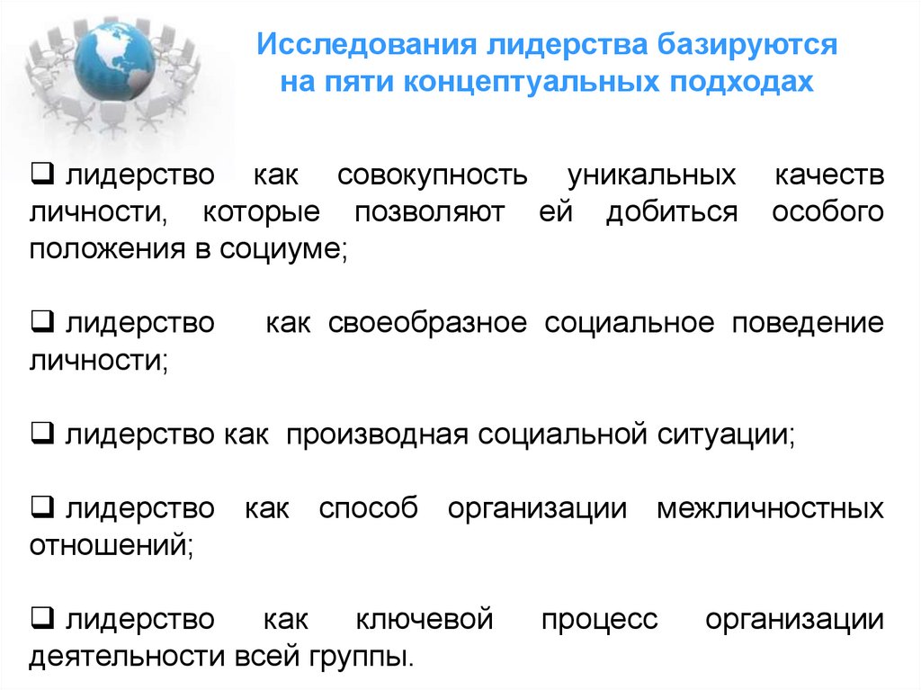 Исследования лидерства базируютсяна пяти концептуальных подходах