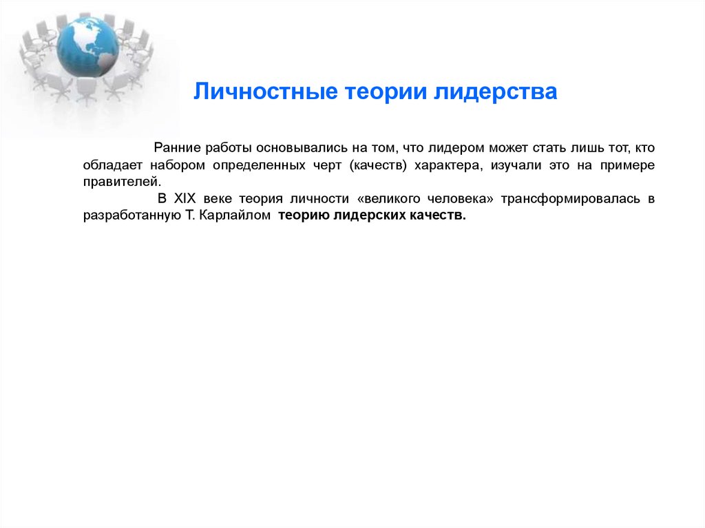 Личностные теории лидерстваРанние работы основывались на том, что лидером может стать лишь тот, кто