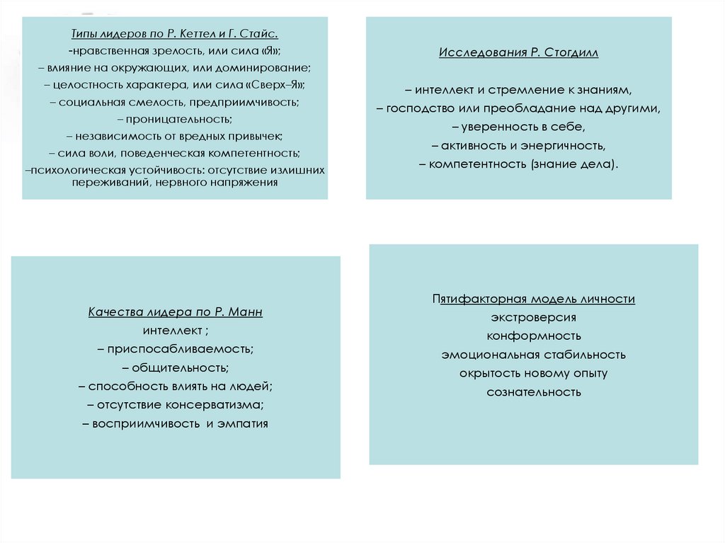 Типы лидеров по Р. Кеттел и Г. Стайс.-нравственная зрелость, или сила «Я»;