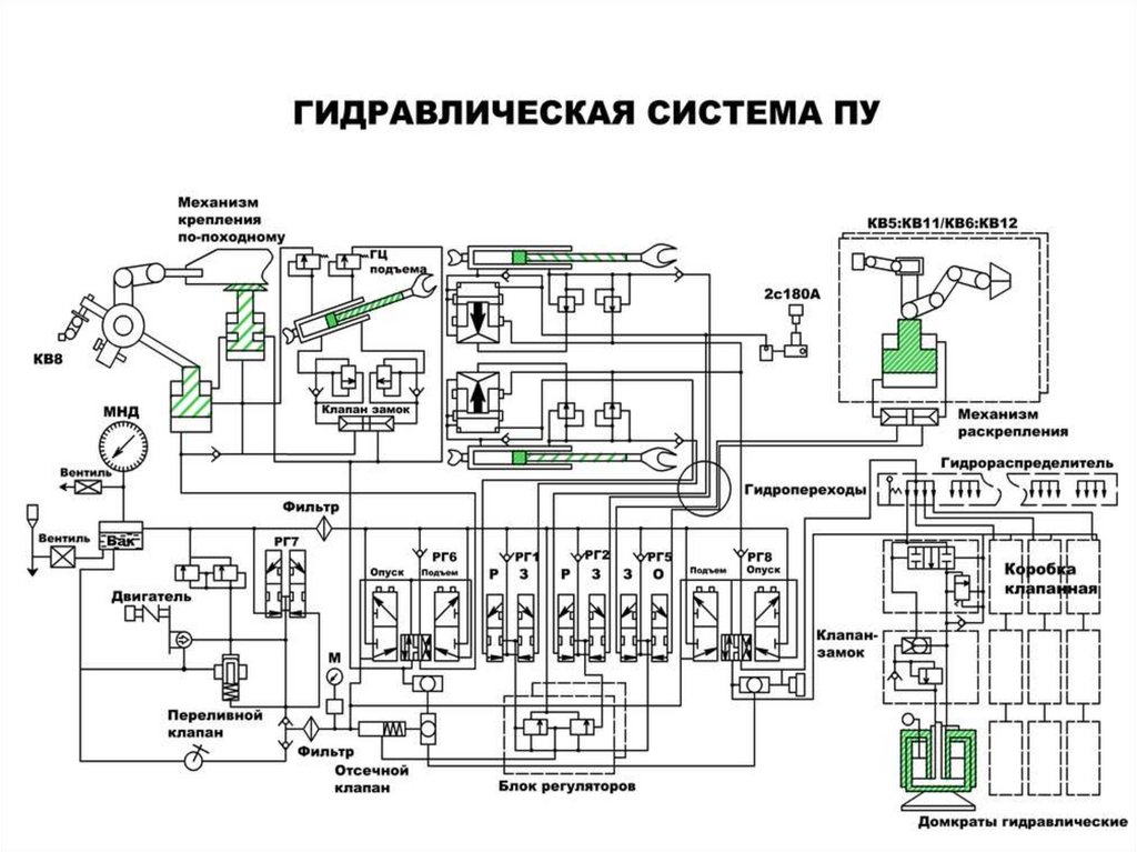 7. Работа гидросистемы ПУ при опускании домкратов на грунт и подъеме с грунта