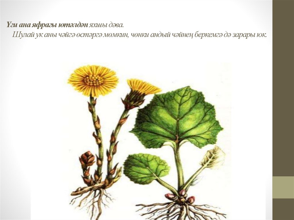 Үги ана яфрагы ютәлдән яхшы дәва.Шулай ук аны чәйгә өстәргә мөмкин, чөнки андый чәйнең беркемгә дә зарары юк.