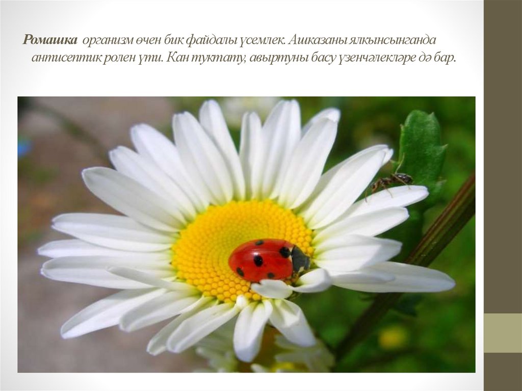 Ромашка организм өчен бик файдалы үсемлек. Ашказаны ялкынсынгандаантисептик ролен үти. Кан туктату, авыртуны басу үзенчәлекләре дә бар.