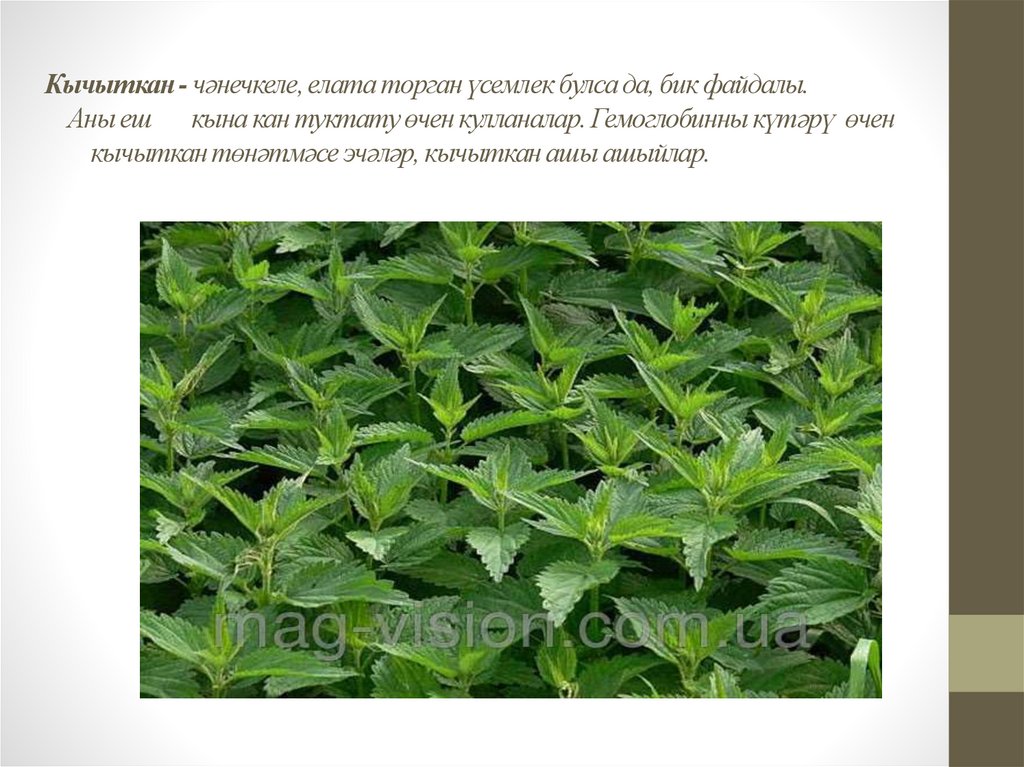 Кычыткан - чәнечкеле, елата торган үсемлек булса да, бик файдалы.Аны еш кына кан туктату өчен кулланалар. Гемоглобинны күтәрү өчен
