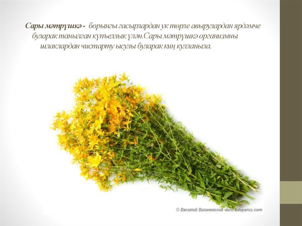 Сары мәтрүшкә - борынгы гасырлардан ук төрле авырулардан ярдәмчебуларак танылган күпъеллык үлән.Сары мәтрүшкә организмны